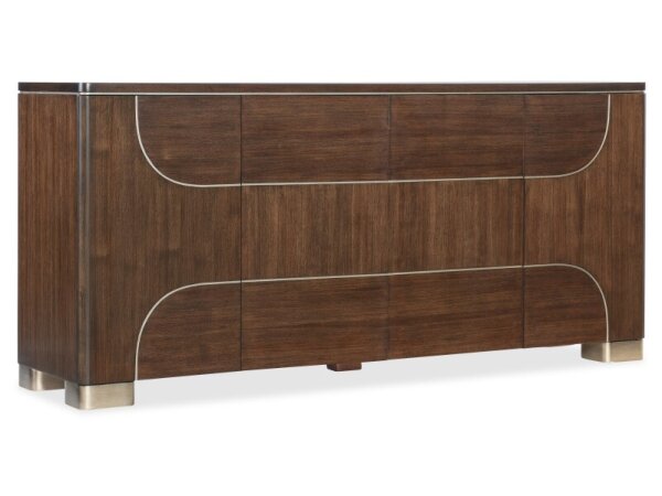 Dark walnut entertainment credenza with a contrasting veneer pattern and champagne-accented trim and feet. Two shelves organize media and components; fits up to a 75 in. TV.