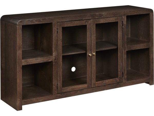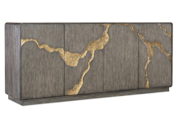 Dark oak entertainment credenza with gold-tone fissure-motif doors and an olive green interior. Soft-close storage with adjustable shelves, a ventilated back and a 3-plug outlet; fits up to an 80 in. TV.