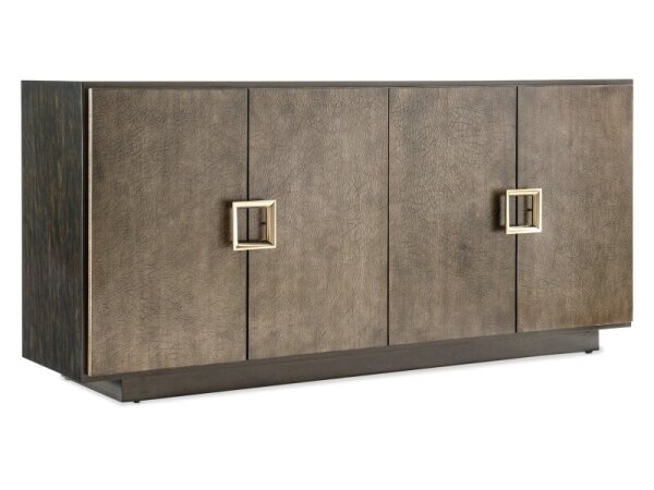 Figured primavera entertainment credenza with a canvas crackle finish, plinth base and champagne buckle pulls. Soft-close doors conceal adjustable shelves and drawers, with a vented back and power; fits up to a 75 in. TV.
