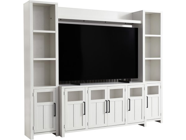 The Allyson Park Entertainment Hutch is crafted from poplar solids and oak veneers with a wirebrushed white finish. It features LED touch lighting, an adjustable shelf, and wire management provisions to conceal wiring.