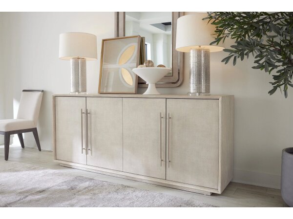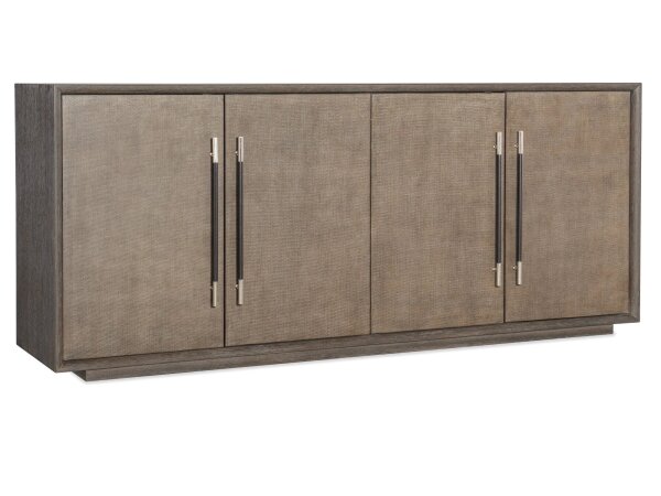 Sleek entertainment console in Quartered Oak with raffia-wrapped doors, warm pewter hardware and leather accents. Four soft-close doors conceal adjustable shelves, ventilated back, cord management and a 3-plug outlet; fits up to 80 in. TVs.