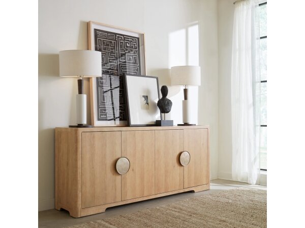 78" (198.1 cm) Home Entertainment Vineyard Row Entertainment Credenza highlighted with Pecky Hickory Veneers and Metal, bringing a subtle decorative character.
