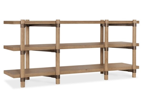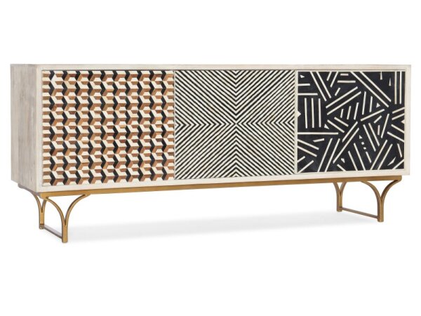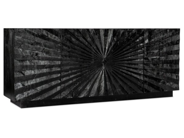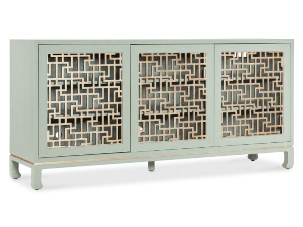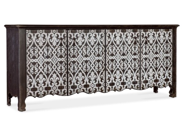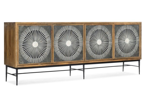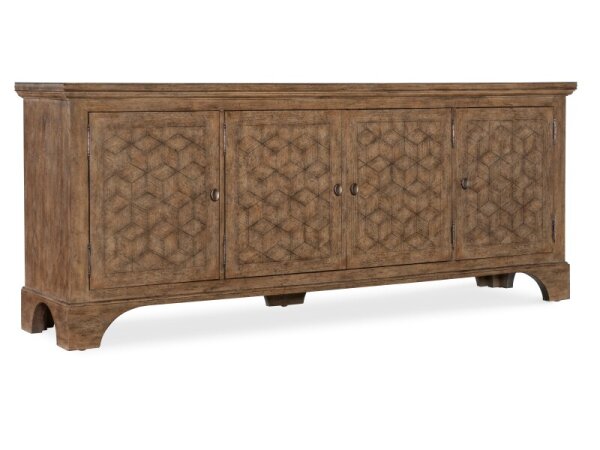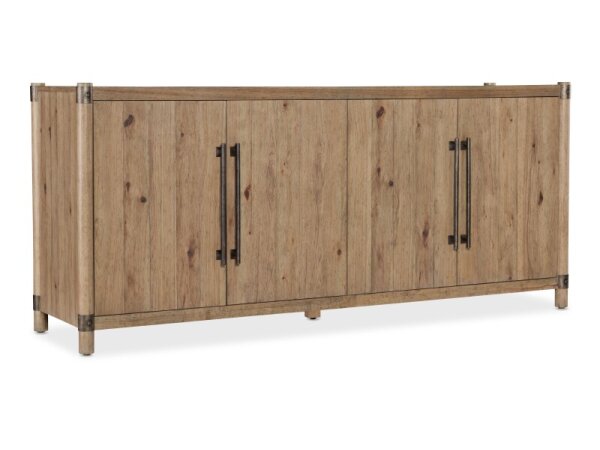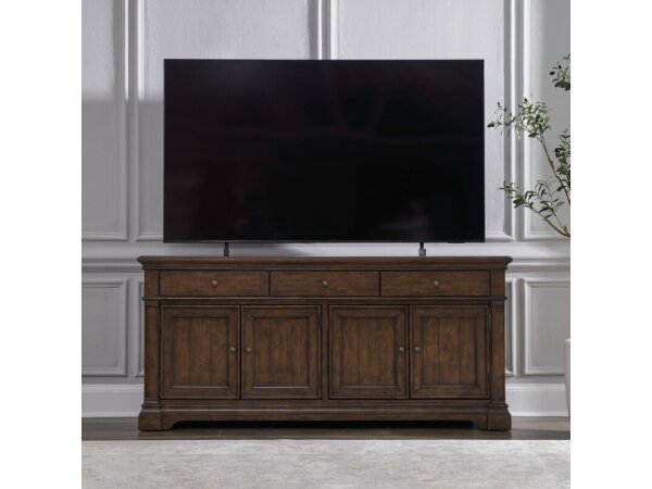 This 74-inch TV console, crafted from poplar solids and rustic birch veneers in a satin cherry finish, blends traditional charm with rustic elegance. It features three drawers, four wood-framed doors with adjustable shelves, and wire management provisions