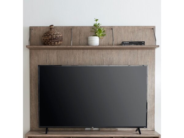 This entertainment deck with shelf is crafted from rubberwood solids and white oak veneers with a wire-brushed burnished beige finish. It features a floating shelf suspended by metal tubing and wire management provisions for a tidy setup.