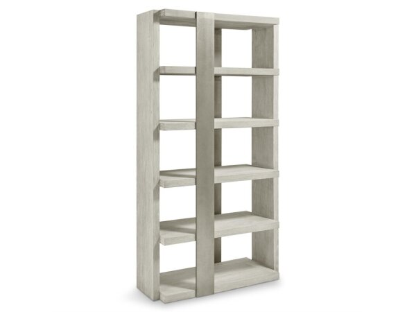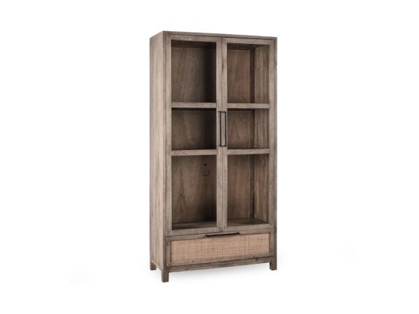 Oak-veneer credenza with reeded two-door front on slender metal legs, finished in soft taupe Terrain. Soft-close, touch-latch doors open to an adjustable shelf for tidy storage.