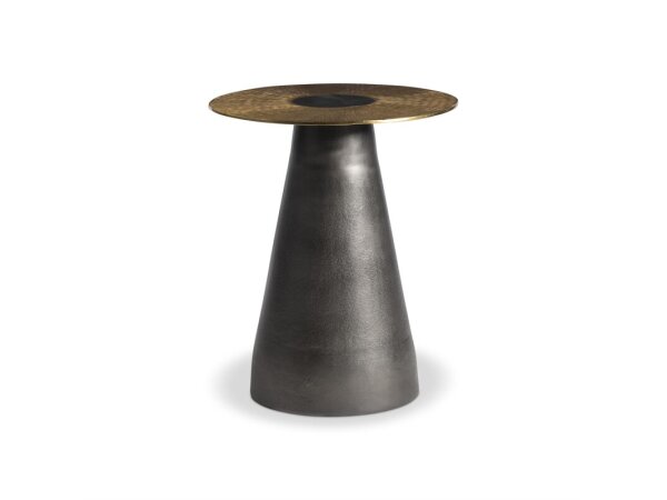 Round accent table with hammered metal cladding in a Satin Brass finish over birch veneers and aluminum. A living room spot table that adds texture and warm metallic shine.