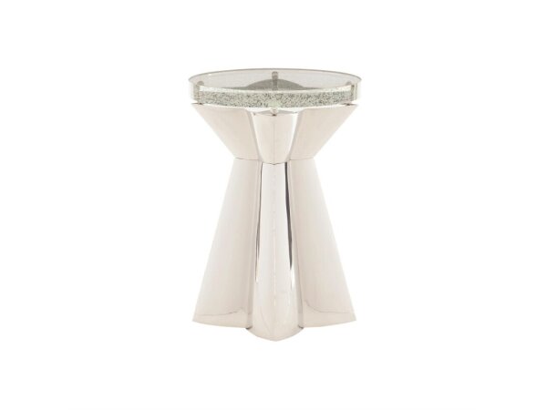 Artistic and modern, this end table pairs a sparkling bubble glass top with an asymmetrical stainless steel base.