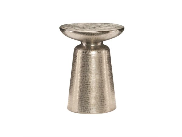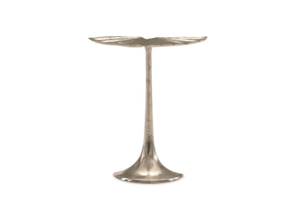 With an intriguing sculptural shape and luminous nickel finish, this round chairside table is an artistic, luxurious accent piece.