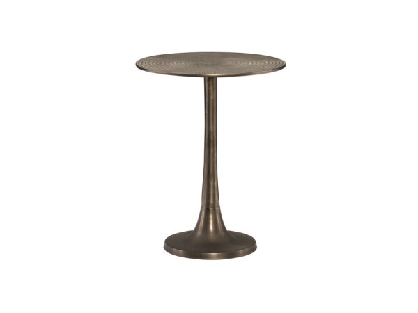 This sculptural round chairside table is crafted entirely from cast aluminum etched with a circular pattern.