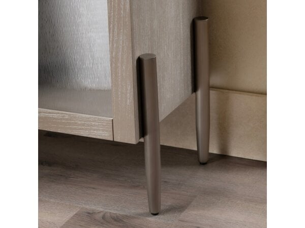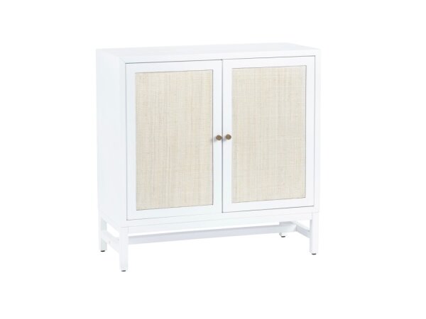 Two-door credenza in medium oak veneer with contrasting parchment-toned canvas crackle on the doors and sides. Soft-close doors conceal an adjustable shelf for streamlined storage.