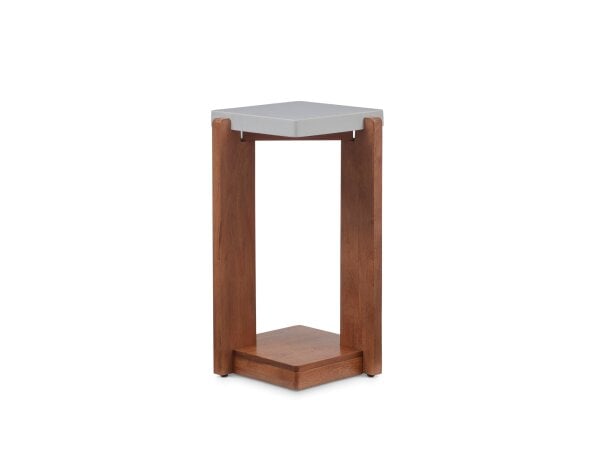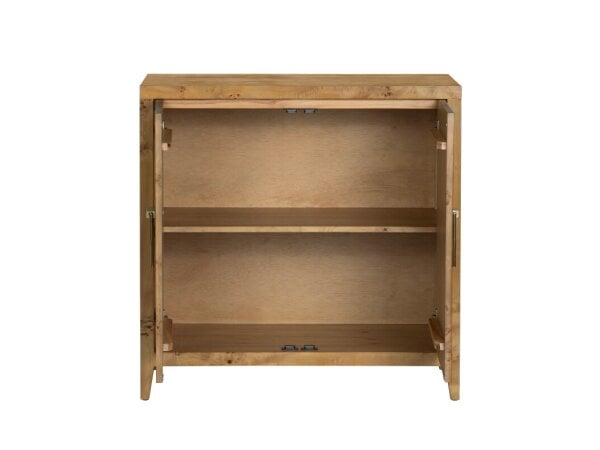 Accent chest with a shimmery wood finish and dyed brown burl veneer door fronts, finished with clear acrylic bar pulls. Provides one interior shelf in a 41 in. wide case.