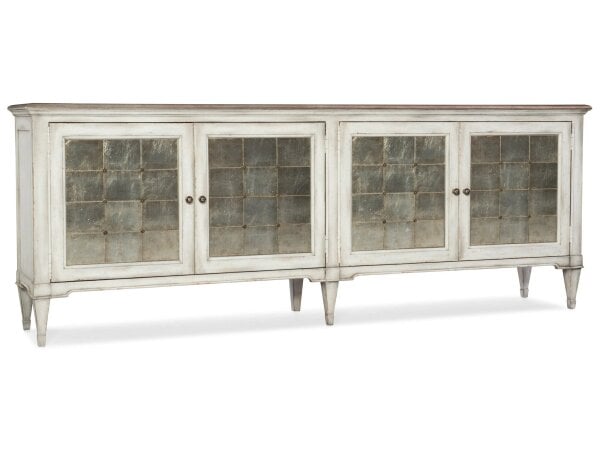 Four-door credenza in maple veneer and eglomise with metal accents, finished in a white crackle with a heavily waxed aluminum top. Ventilated back with four interior shelves; accommodates up to an 80 in. TV.