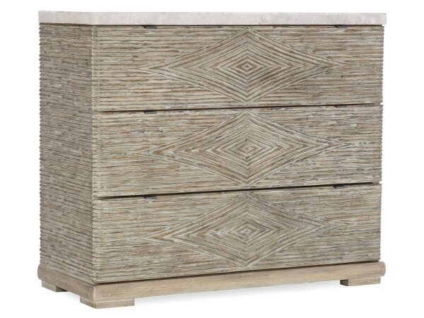 Modern-casual three-drawer accent chest crafted from pecan, maple and oak veneers with a Crema marble top. Brie grey finish with reeded, diamond-pattern fronts and silver-colored tab pulls for refined storage.