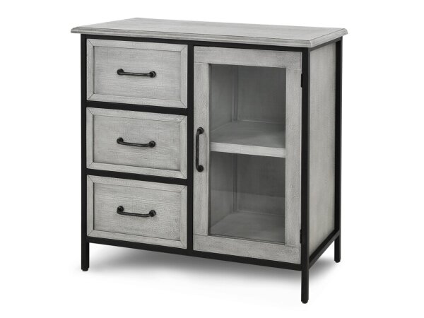 Amador Cabinet Gray Wooden And Black Metal 3 Drawer 1 Door Cabinet With Glass
