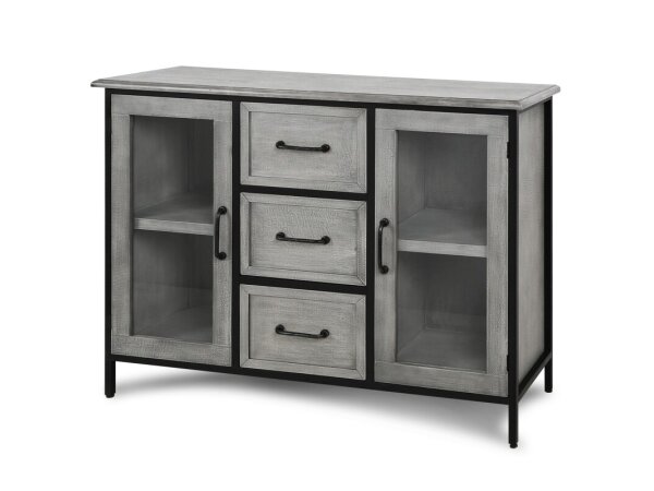 Amador Large Cabinet Gray Wooden And Black Metal 3 Drawer 2 Door Cabinet With Glass