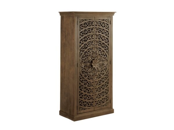 This Palmetto Heights accent buffet is crafted from rubberwood solids and white oak veneers with a two-tone Driftwood and Shell White finish. It features four wood-framed doors with double X-style overlays, European soft-close hinges, and adjustable shelv
