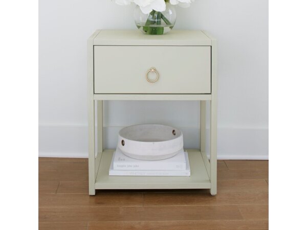 Accent table in Green Mist with one drawer on full-extension guides and an open bottom shelf for display and storage; acacia solids/MDF with birch veneers and brass ring hardware.