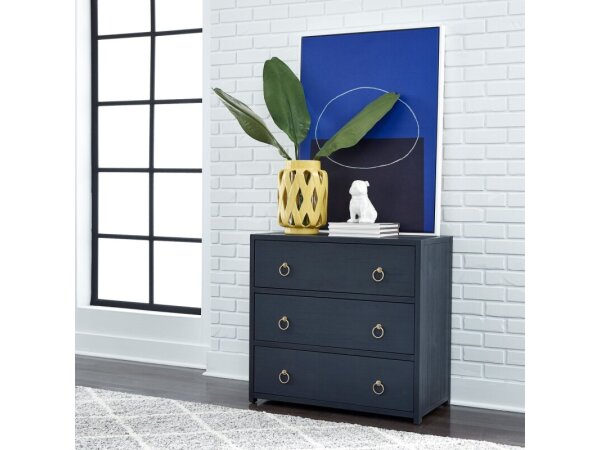 Crafted from Acacia solids and veneers with a wire brushed Denim finish, this accent cabinet features brass ring hardware. It offers three deep, full extension drawers for versatile storage.