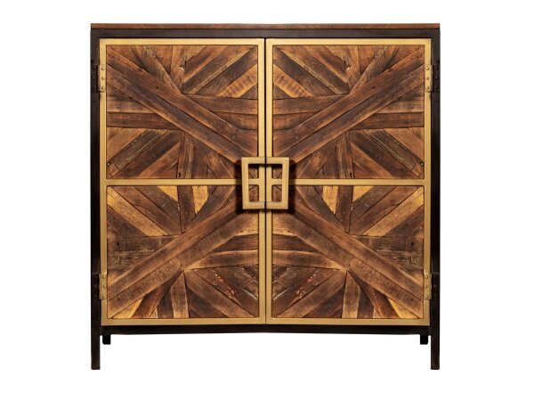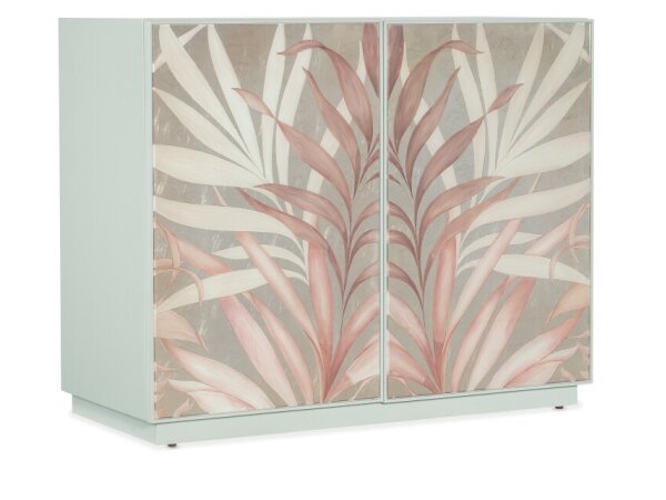 Transitional accent chest in mint green with gold-leafed door fronts hand painted with palms in pink, white, gold and silver. One interior shelf offers simple storage behind the doors.