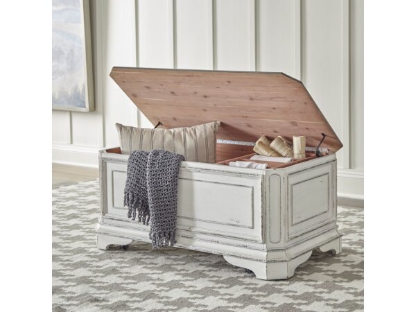 This Magnolia Manor pet feeder cabinet is crafted from poplar solids, white oak, and birch veneers with an antique white finish. It features three full extension drawers, two metal feeding bowls, four leash hooks, and one adjustable shelf behind a door.