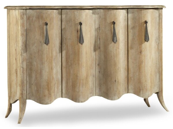 Light wood credenza with tassel-like hardware, shaped front, and cabriole legs. Elm veneers with two adjustable shelves and a ventilated back panel for media use.