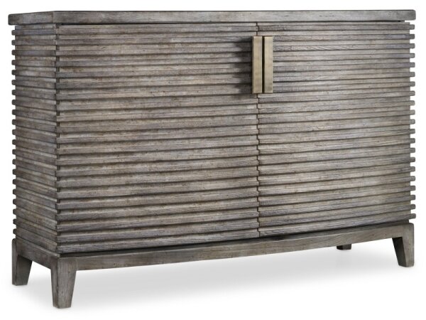 Oak veneer chest in an earthy gray finish with copper-tone accents and pulls. Two soft-close doors hide an adjustable shelf and a ventilated back for media use.