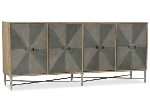 Four-door credenza in elm, maple and black walnut with a natural case, gray diamond-pattern fronts, lucite pulls, and a silver metal base. Soft-close doors with adjustable shelves.