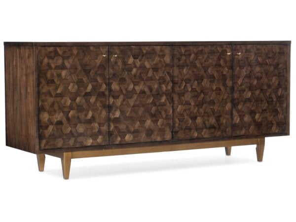 Walnut veneer credenza with a timeless marquetry pattern and medium wood finish. Four doors with adjustable shelves and a ventilated back panel support media storage.