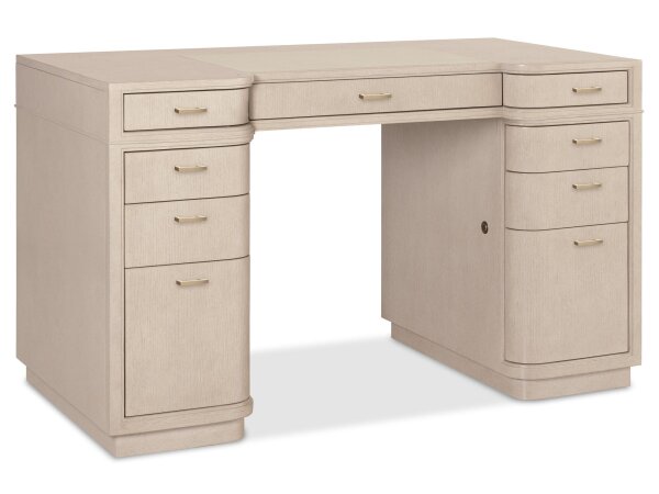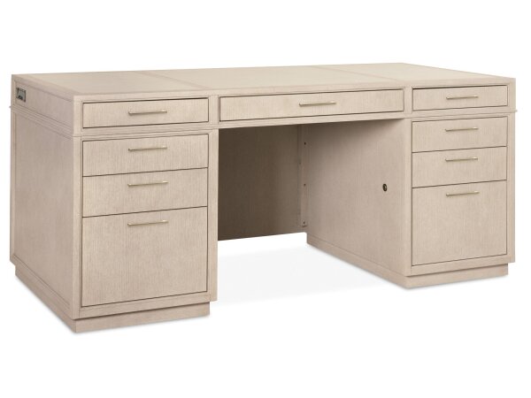 Transitional office desk with a top-grain leather writing surface and nine drawers for organization. Features a drop-front keyboard drawer, removable organizers, locking file storage, and a Polished Limestone oak finish.