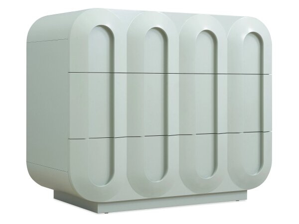 Curved-front accent chest in a deep midnight finish with champagne pulls and three drawers for tidy storage. A dramatic transitional storage piece that can double as a nightstand.