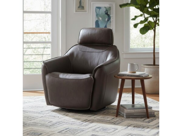 This petite-scale swivel accent chair features power footrest and tilt functions, plus integrated Bluetooth speakers for an immersive experience. It is upholstered in pigmented top grain leather and includes an adjustable, removable headrest.
