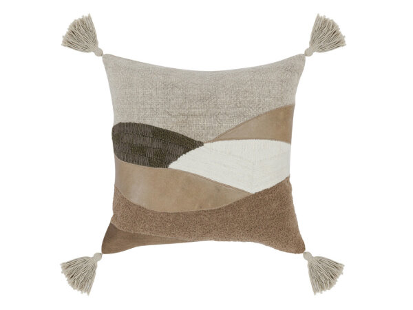 Hand-applied embroidery and fabric pieces, create an evocative pillow rife with visual and textural interest. Contrasting pieces of cotton, Linen,