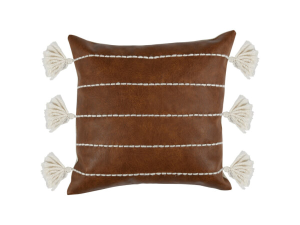 Classic with a dash of playfulness, this vegan leather pillow features classic stripes accented with plush tassels. Hand embroidery gives