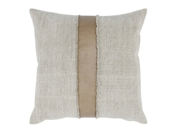 This versatile throw pillow featuring a mix of genuine leather and a linen cotton blend, can sit horizontally or vertically,