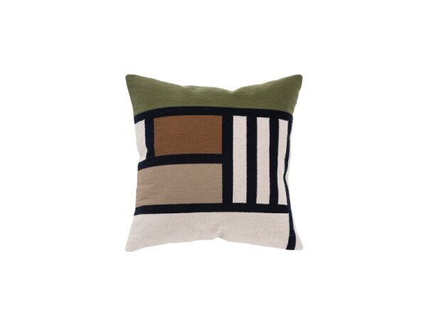 20 in. throw pillow with a Bauhaus‑inspired color‑blocked design in earth tones and bold black lines, finished with a knife edge and hidden zipper; includes insert.