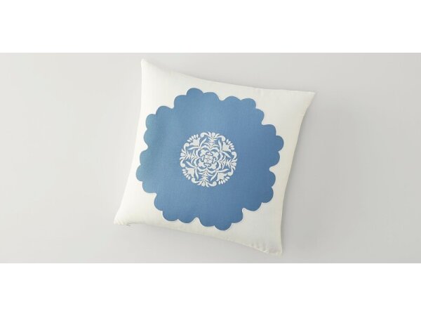 20 in. square cotton chambray pillow with an embroidered applique medallion and scalloped border, finished with a knife edge and zip closure. Includes a down/feather insert.