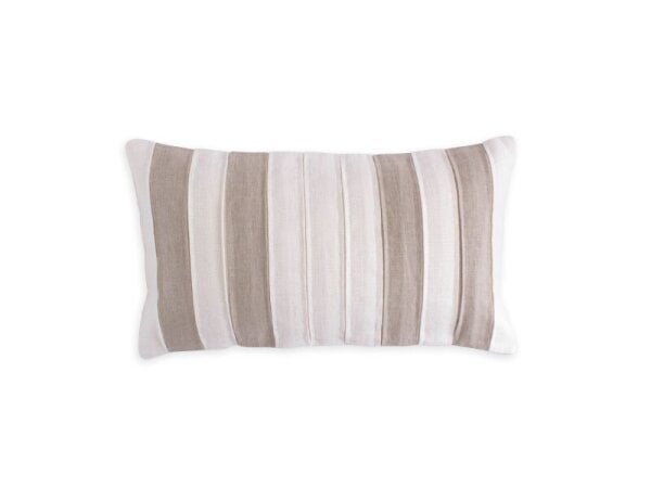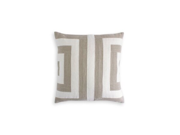 A 100% linen throw pillow with an appliqued two-tone pattern and subtly sheened embroidered edges. Lined for crisp structure and finished with a hidden back zipper.