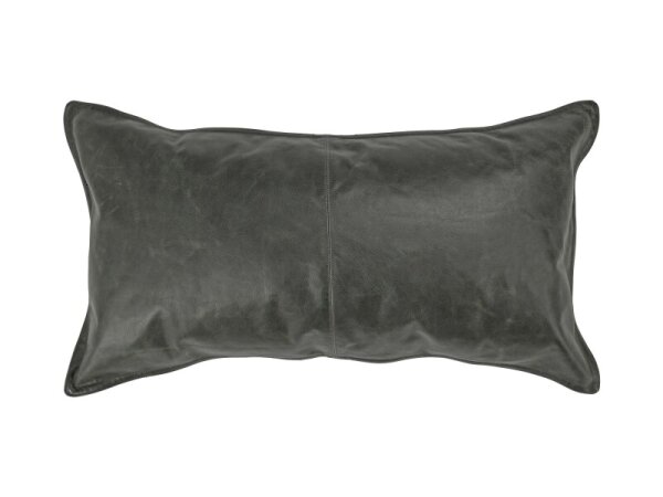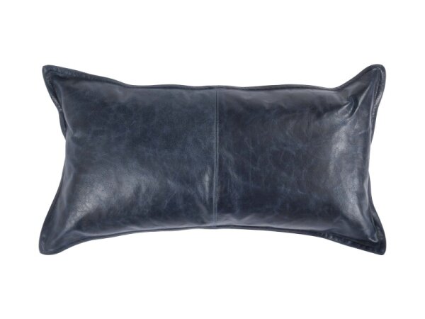 A dyed and distressed genuine leather lumbar pillow cover with stitched detailing, paired with a 100% cotton back and hidden zipper. Finished with a double-stitched flange edge.