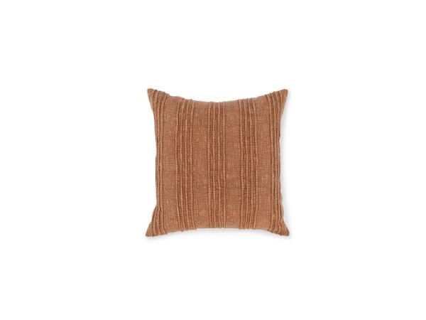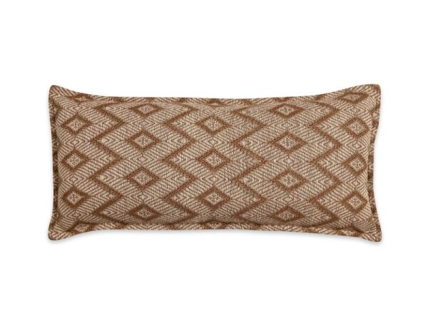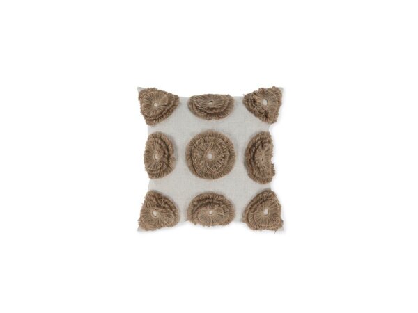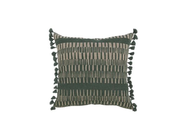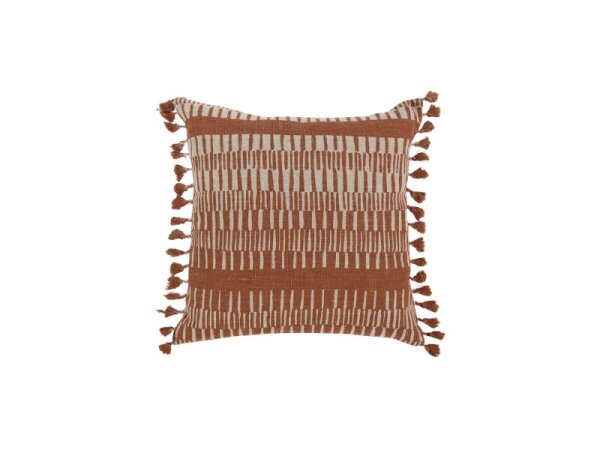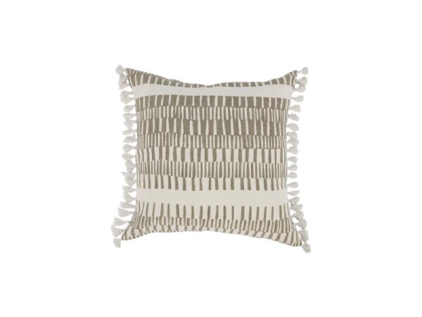 20 x 20 linen throw pillow with an intricate geometric hand print, mini tassels on both sides, and a cotton/linen back with knife-edge and hidden zipper. Includes down/feather insert.