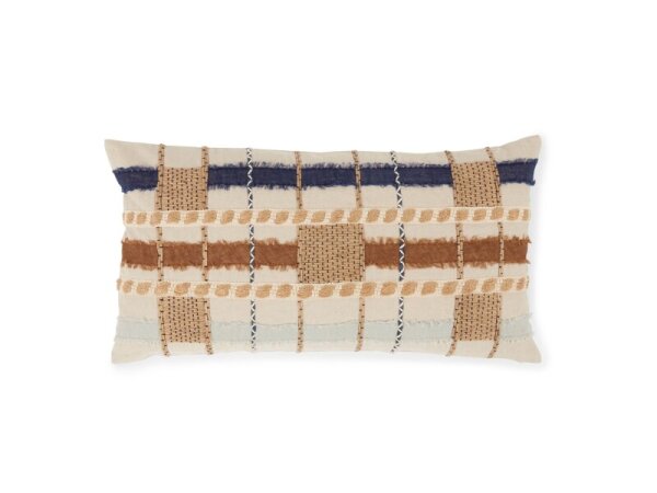 14x26 in. lumbar pillow with hand-cut sheer linen appliqué, jute rope accents, and cotton embroidery. Includes a down insert.