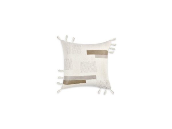 22 in. square accent pillow featuring hand-knotted embroidery, genuine leather appliques, and handmade tassels on a cotton-linen blend. Cover only (insert not included).