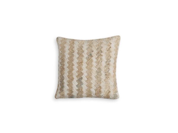 Decorative pillow featuring hand-knotted embroidery, genuine leather applique, and asymmetric tassels for an eclectic look. Includes insert with hidden zipper; 22 x 22 in.