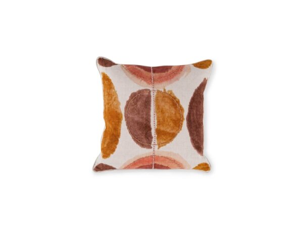 Linen throw pillow with a watercolor-inspired symmetrical design and hand-applied embroidery in clay tones. Available as cover only or with a luxury down insert.