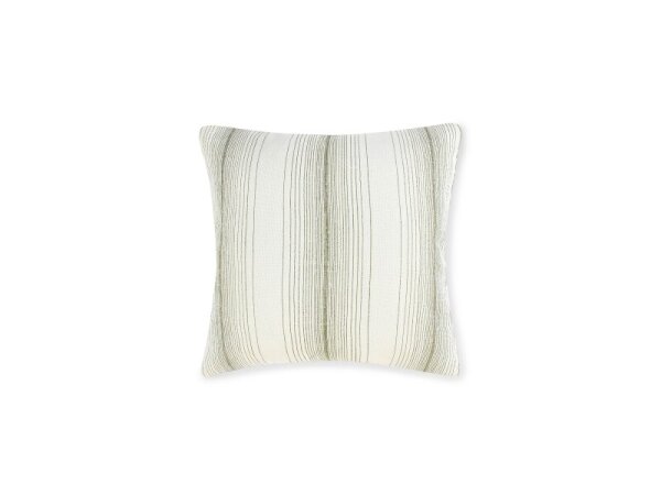 Linen-cotton pillow cover with hand-stitched embroidery and subtle stripes; 26 x 26 in., cover only.