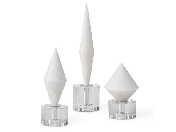Contemporary trio features solid white marble rings supported by polished chrome rods and an elegant crystal base. Sizes: S-6x15x3, M-6x19x3,