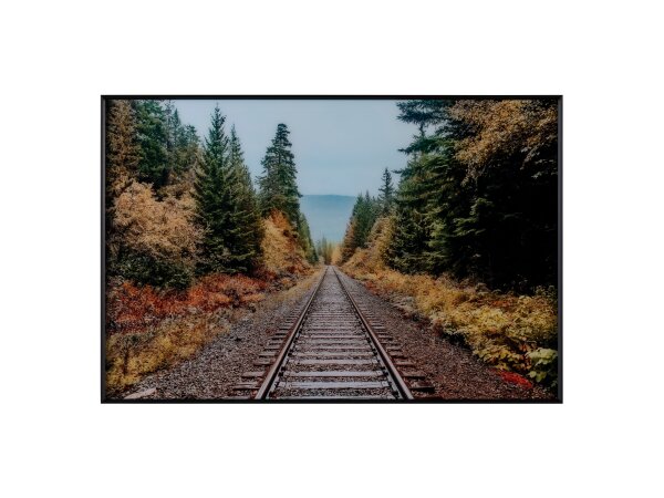 Introducing our Autumn Tracks tempered glass print, featuring a breathtaking scene of train tracks cutting through the trees during the