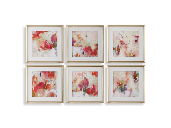These contemporary floral abstracts showcase a beautiful blend of red and orange brushstrokes with pops of chartreuse and gold leafing.