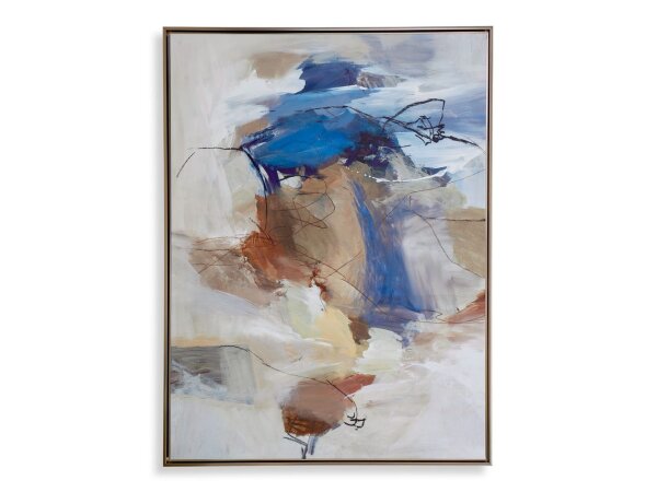 Shades of blue with splashes of raw umber and olive set on a white dove background make up this abstract