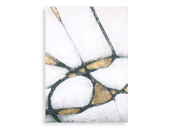 Showcasing an abstract motif, this modern, hand painted canvas emanates bold elegance. A minimal color palette includes white, charcoal, and