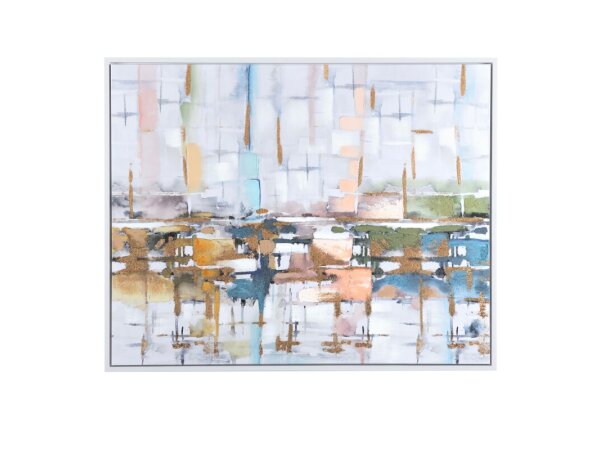 This eye-catching hand painted abstract showcases a mixture of white and teal brushstrokes with burnt orange and gold leaf highlights
